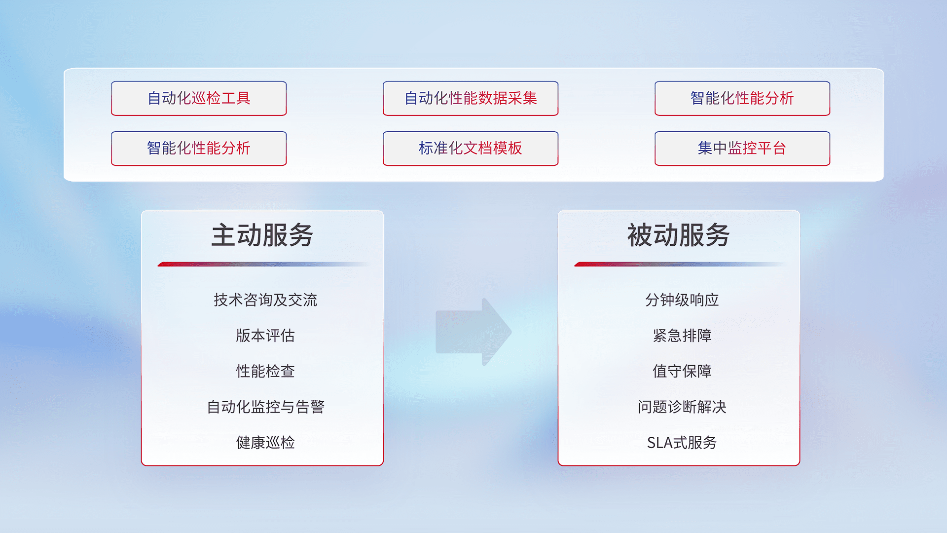 智能化工具和标准化文档,,,,保障服务质量,,提供主动服务(包含技术咨询、、版本评估、、、、性能检查、、、、自动化监控与告警、、、健康巡检)和被动服务包含(分钟级响应、、紧急排障、、、、值守保障、、、问题诊断解决、、、SLA服务)。。。。