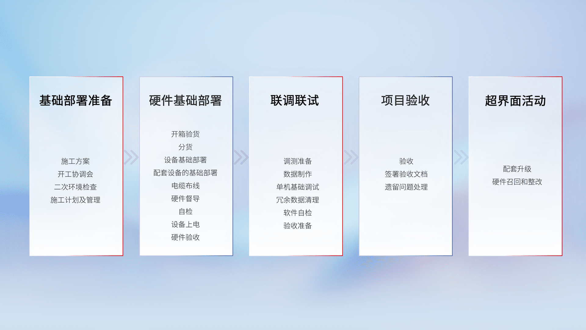从基础部署准备、、、硬件基础部署、、、、联调联试、、项目验收、、、、越界面活动的全过程可追溯,,,保证施工质量和进度。。。